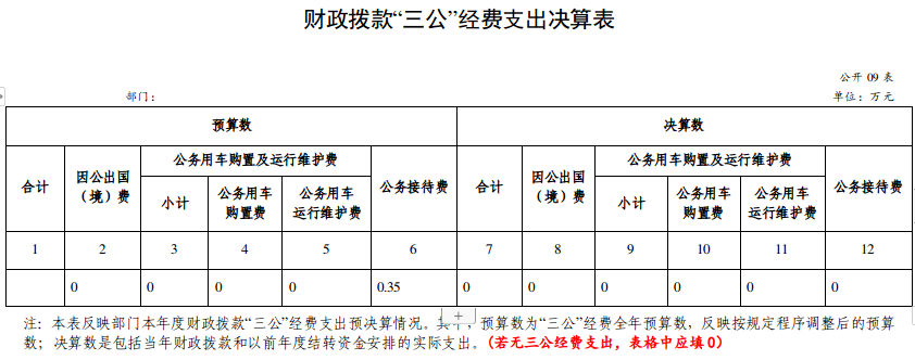 2024年度“三公”经费财政拨款支出预算为0.35万元,支出决算为0万元,完成预算的-0.35%;与上年相比减少0.06万元,降低0.06%。决算数小于预算数的主要原因是厉行节约减少开支。决算数小于上年数的主要原因是本年没有公务接待开支。